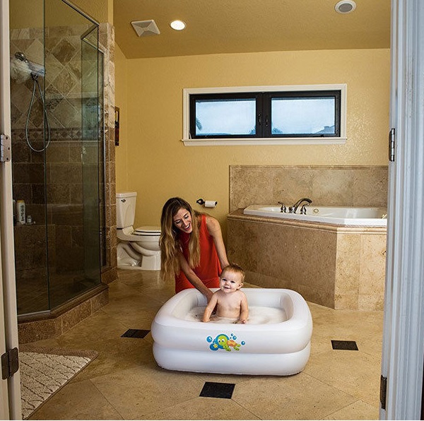 Nafukovací bazének/vanička pro děti se skládá ze dvou samostatně nafukovacích částí. Každá část má bezpečnostní ventil, který zabraňuje úniku vzduchu. Nafukovací spodní část bazénku (dno) brání nekontrolovanému klouzání dítěte a zároveň je velmi pohodlné.
