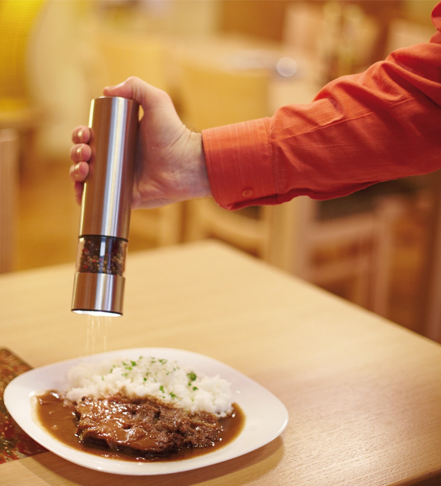 Râșniță electrică pentru diverse condimente. Finețea măcinării se poate regla pe râșniță.