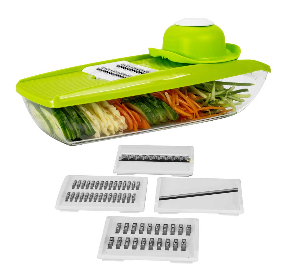 Tocător multifuncțional pentru tăierea rapidă și practică a legumelor și fructelor, cu 5 accesorii diferite.