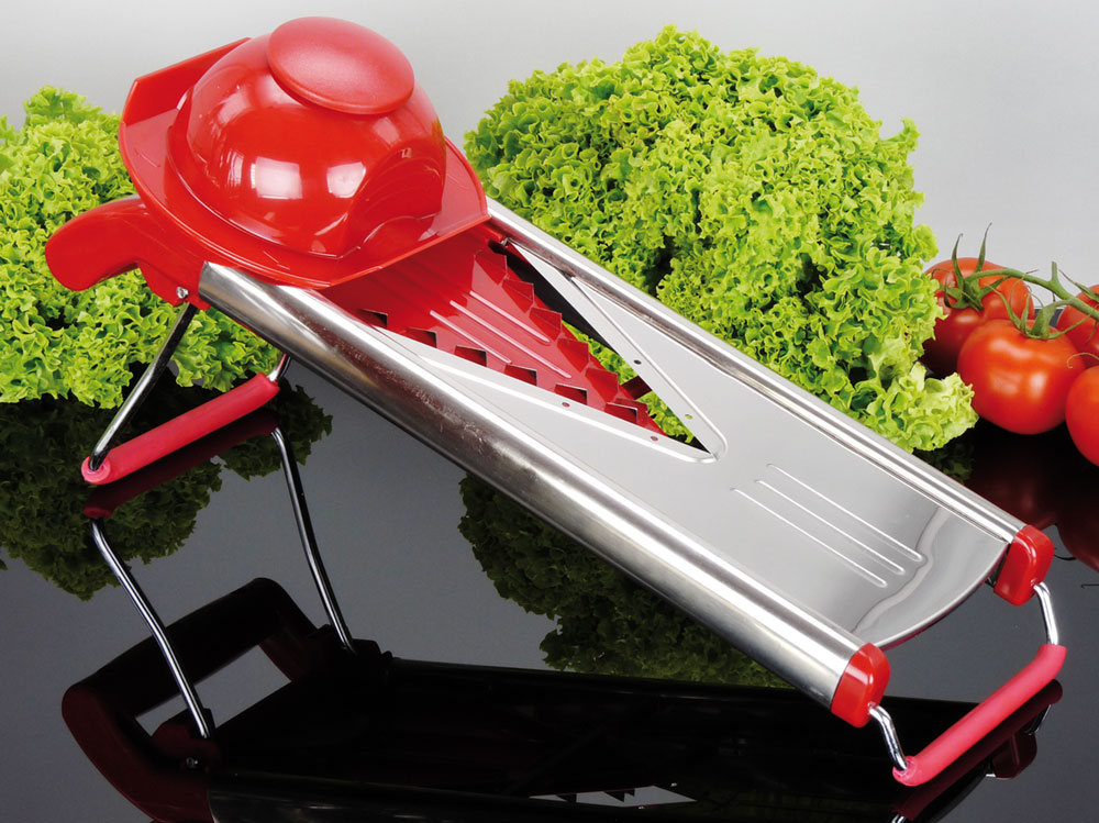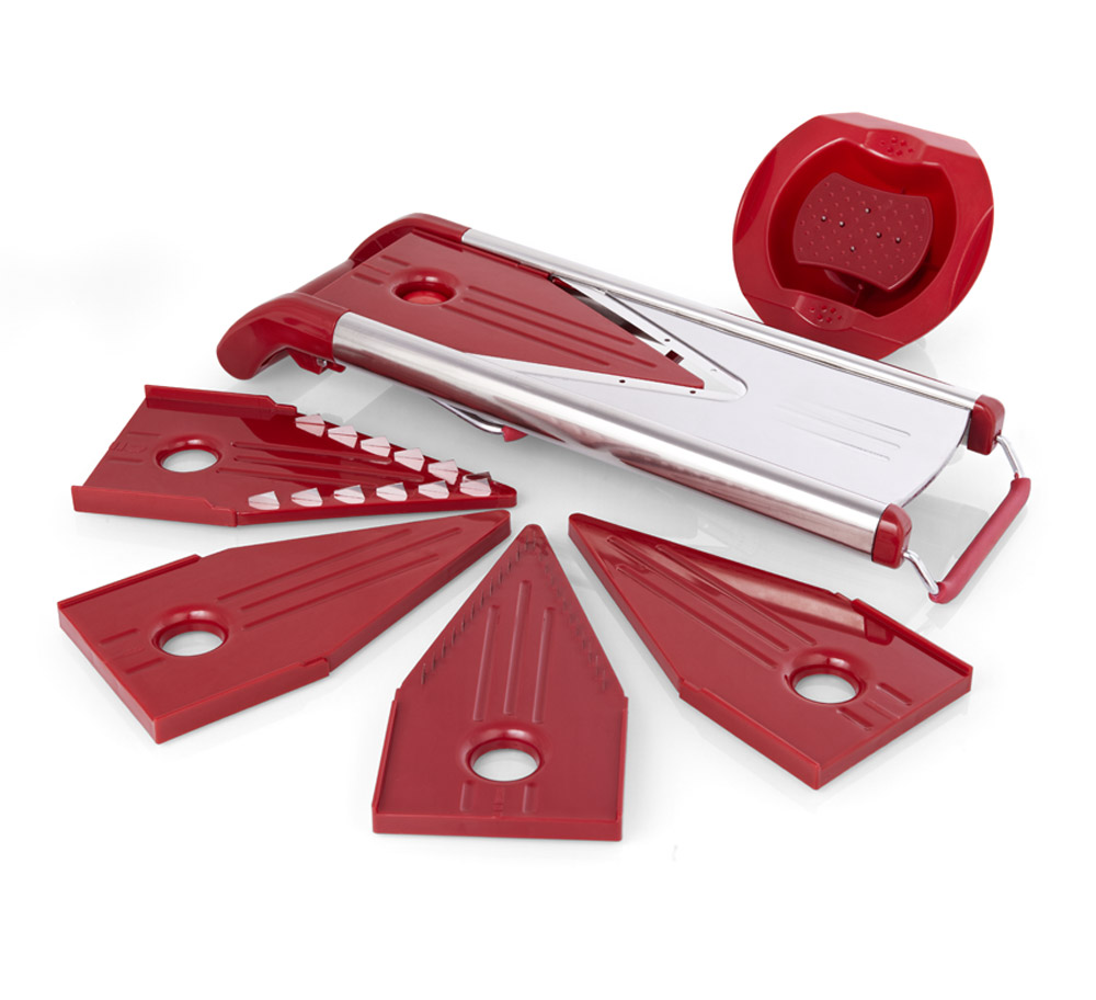 A készlet további tartozékai: biztonsági rögzítő kupak (megvédi a kezet az esetleges sérülésektől), vezető sín az egyenletes aprításhoz, csúszásgátló talp, tartóállvány a késbetétek tárolására. A nemesacél V-aprító rendkívül egyszerűen tisztítható.
