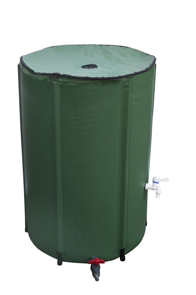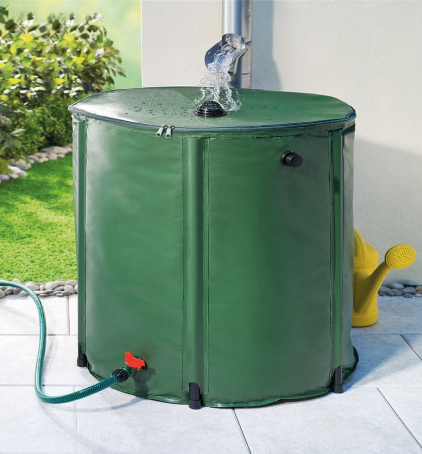 Összecsukható tárolótartály, amely alkalmas az esővíz összegyűjtésére és tárolására, majd a kert öntözésére.