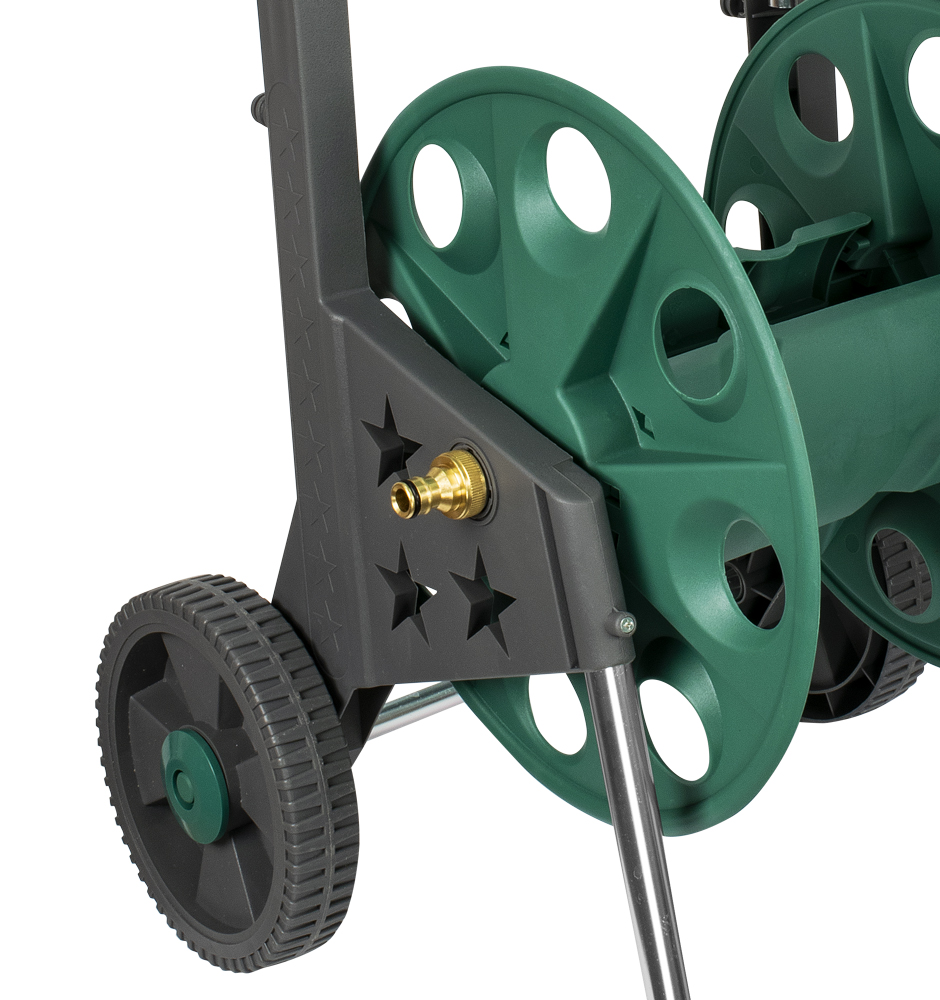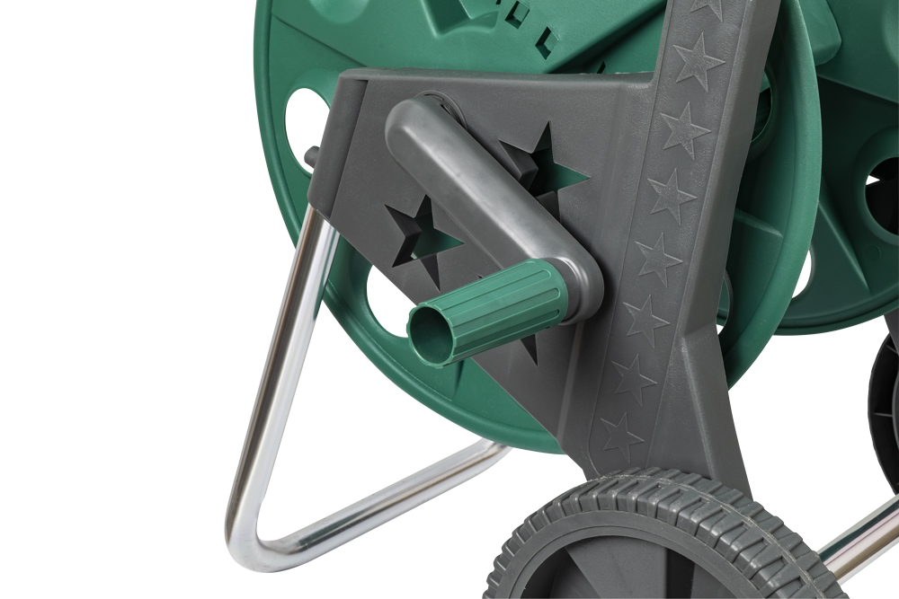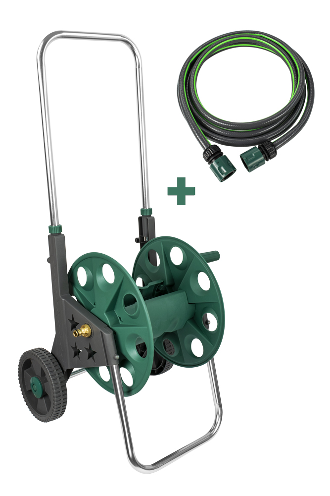 PROFI mobil kerti tömlőkocsi a kerti tömlő gazdaságos tárolására. A kocsi kerekekkel rendelkezik a könnyű mozgatáshoz, kényelmes behúzás kurblival.