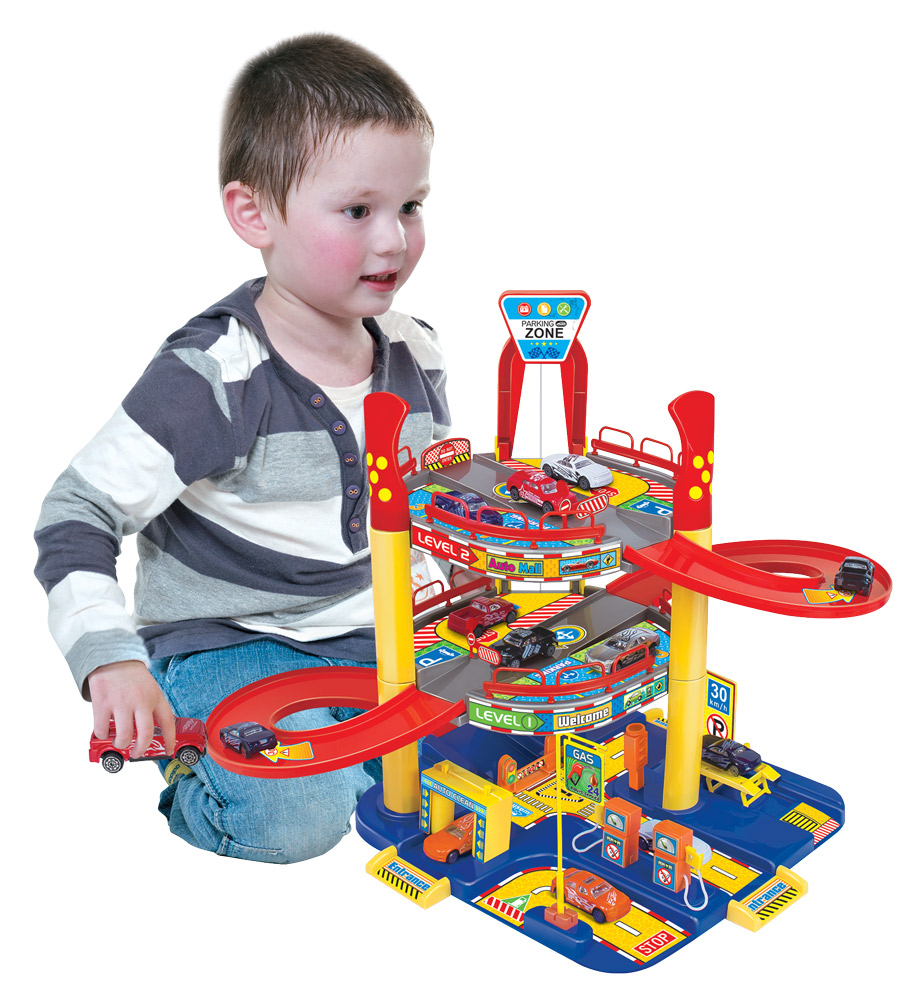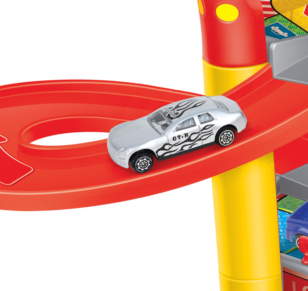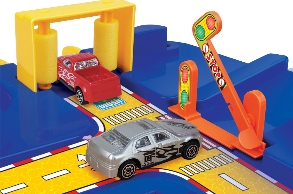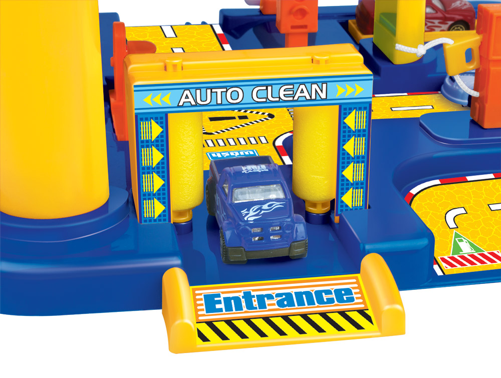 A garázs részei: autómosó, benzinkút, javítóműhely, lift, spirál rámpa, bejárat/kijárat sorompóval. A készlet 6 db autót és matricákat is tartalmaz.