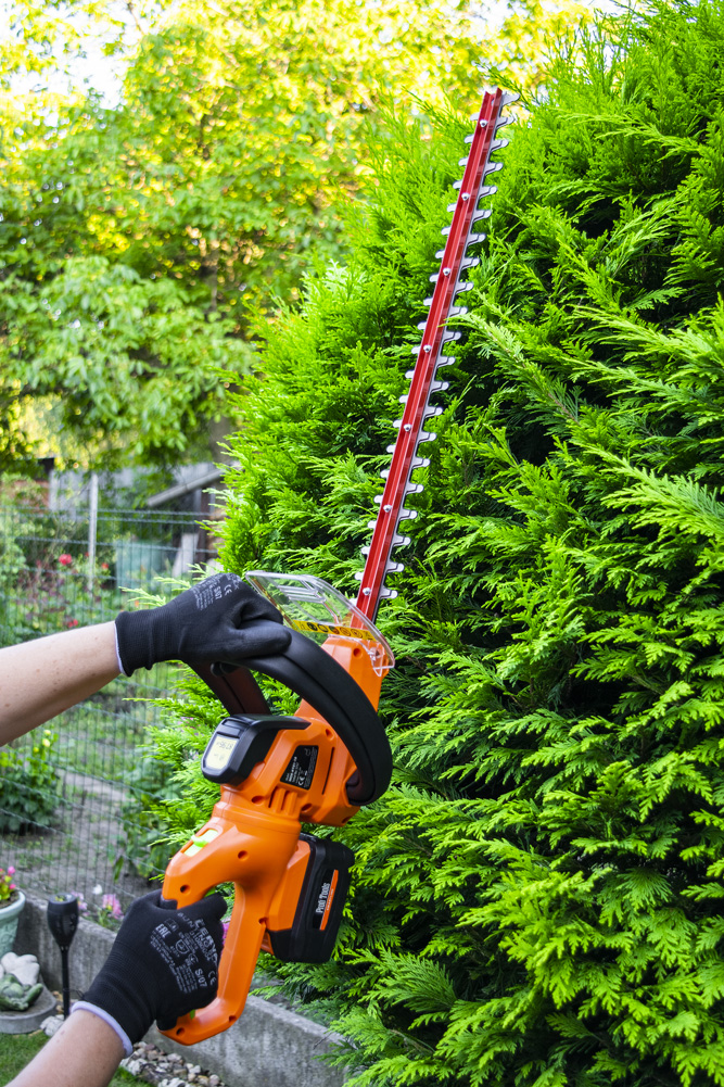 Akkumulátoros sövényvágó élő sövény és zöld kerti növények formára nyírásához. Praktikus és biztonságos megoldás, hálózati kábel átvágásának veszélye nélkül.