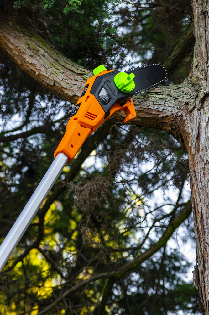 Magasan levő ágak egyszerű vágásához, létra használata nélkül.